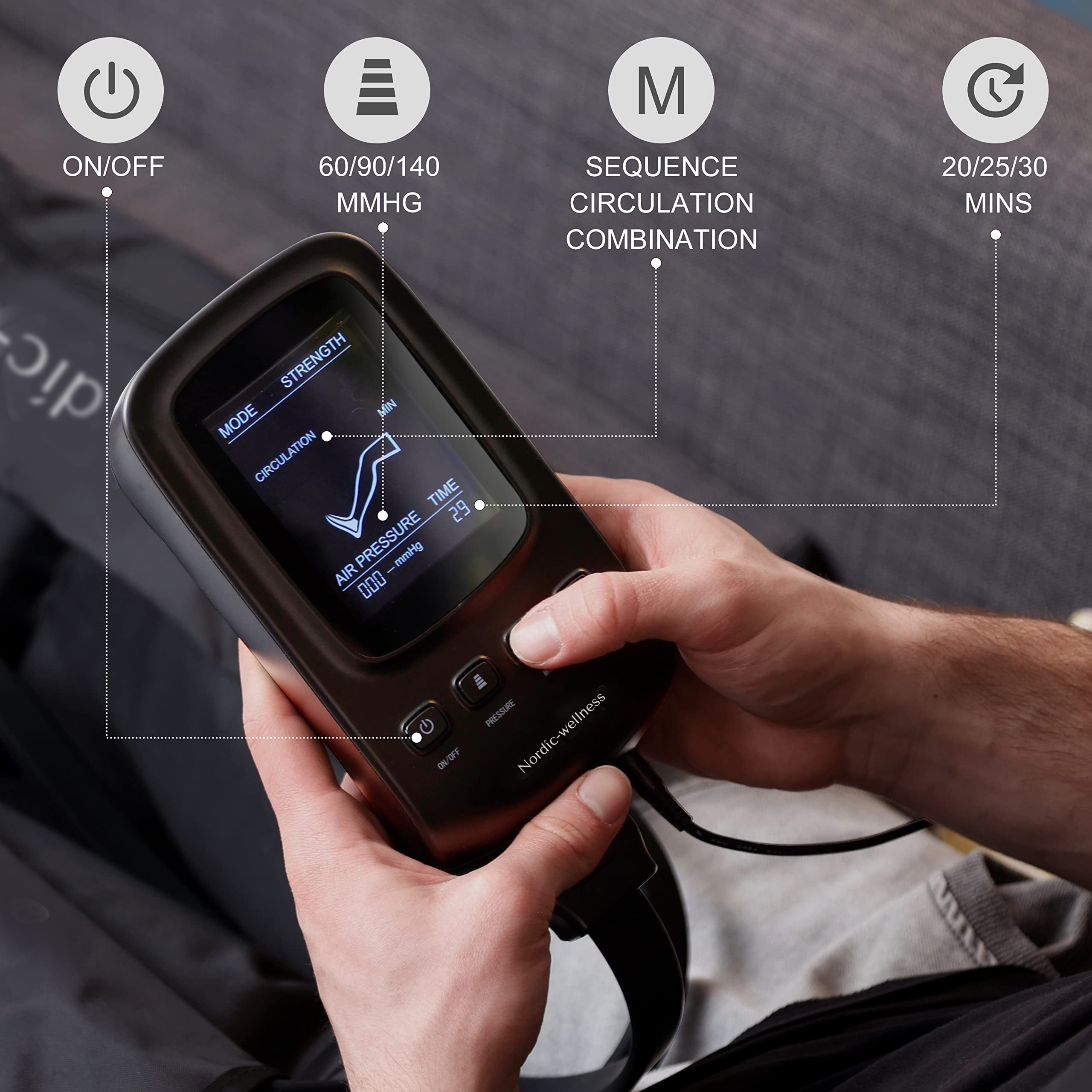 Door middel van luchtcompressie wordt de veneuze doorbloeding gestimuleerd en ondersteunt het apparaat het natuurlijke herstelproces van het lichaam.